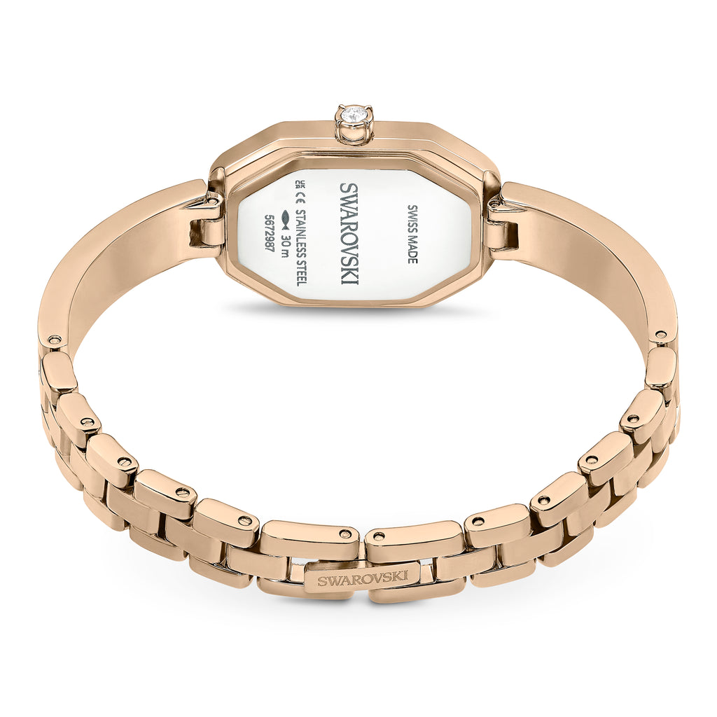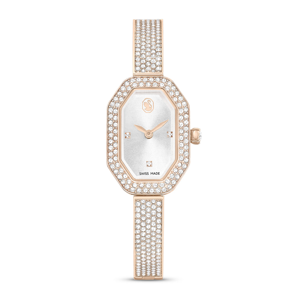Swarovski’nin efsanevi sekizgen şeklinin güzelliğini yakalamayı başaran bu Dextera halka bileklik saat, bileğinizin çevresini saran detaycı bir simetri örneği sunuyor. Şampanya altın rengi bir yüzeyle tamamlanan 20 mm x 30,5 mm boyutlarındaki kasa, çerçeve üzerinde 92 adet kristalden oluşan bir pavé ile süslendi. Bu süsleme, saat 12 yönünde bir kuğu logosuna ve üç adet kristalize gösterge işaretine yer veren güneş ışını kadran için mükemmel bir çerçeve oluşturuyor. Kurma koluna göz kamaştırıcı tek bir taş yerleştirilmiş olan saat, ayarlanabilir bileklik boyunca yerleştirilen 194 adet kristalle hayat bularak her saat başı benzersiz bir güzellik sunuyor. 30 m’ye kadar suya dayanıklı olan bu İsviçre yapımı saat, neşeli görkemi benzersiz Swarovski savoir-faire’i ile birleştiriyor.